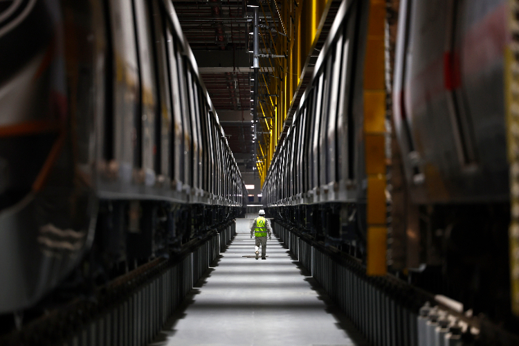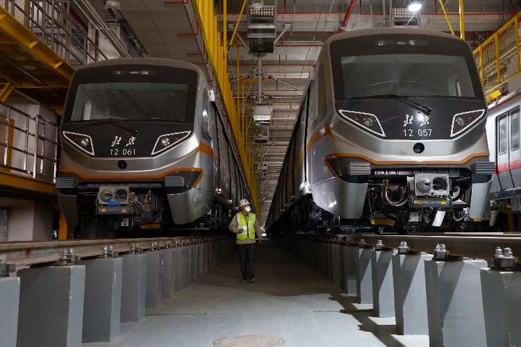 2月20日,工作人员在北京地铁12号线东坝车辆段巡查列车。(图片来源:中新社)