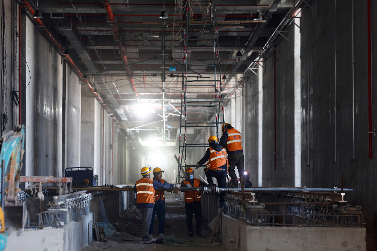 2月20日,施工人员在北京地铁12号线东坝车辆段施工。(图片来源:中新社)