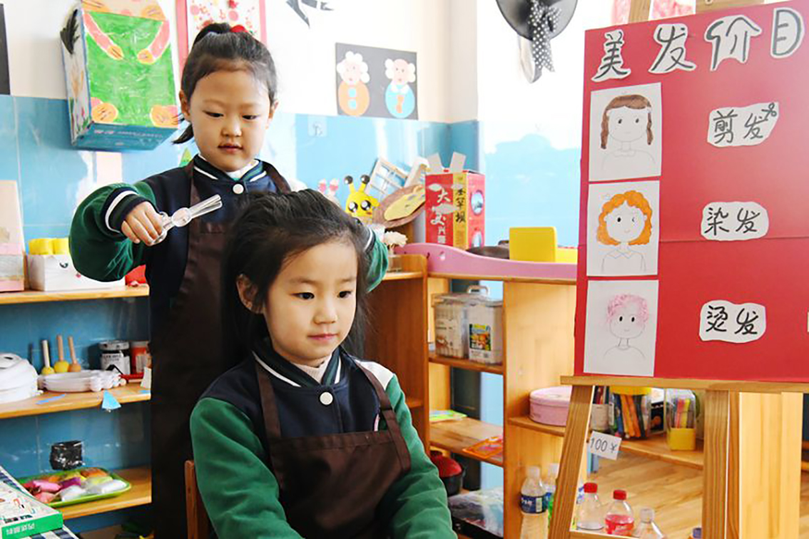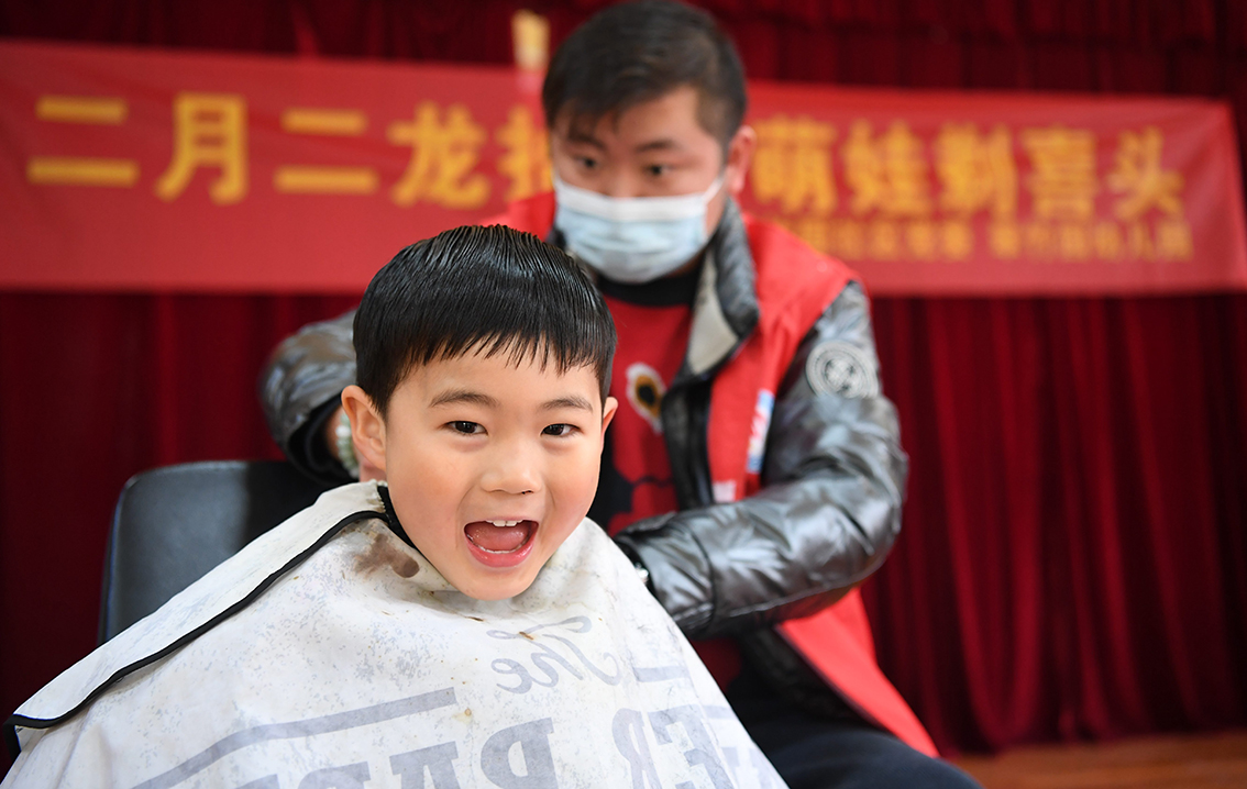 2月21日,河北省邯郸市广平县一家幼儿园,小朋友体验“二月二”理发。(图片来源:中国日报网)