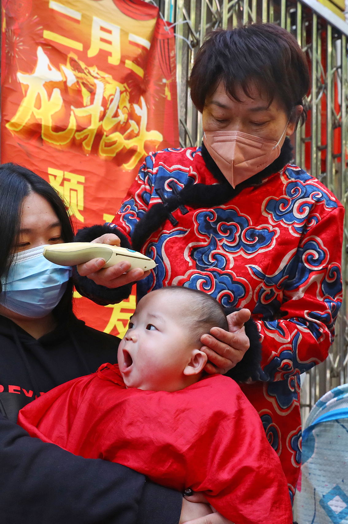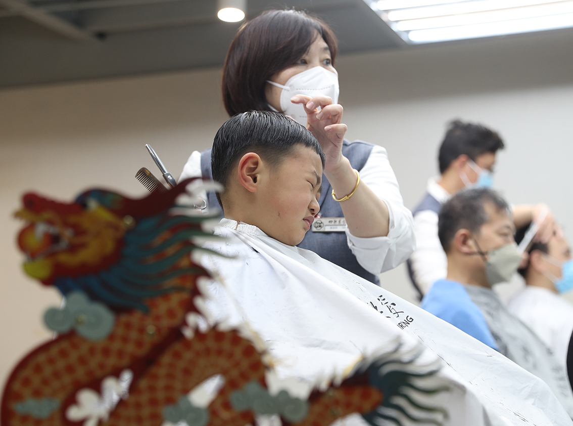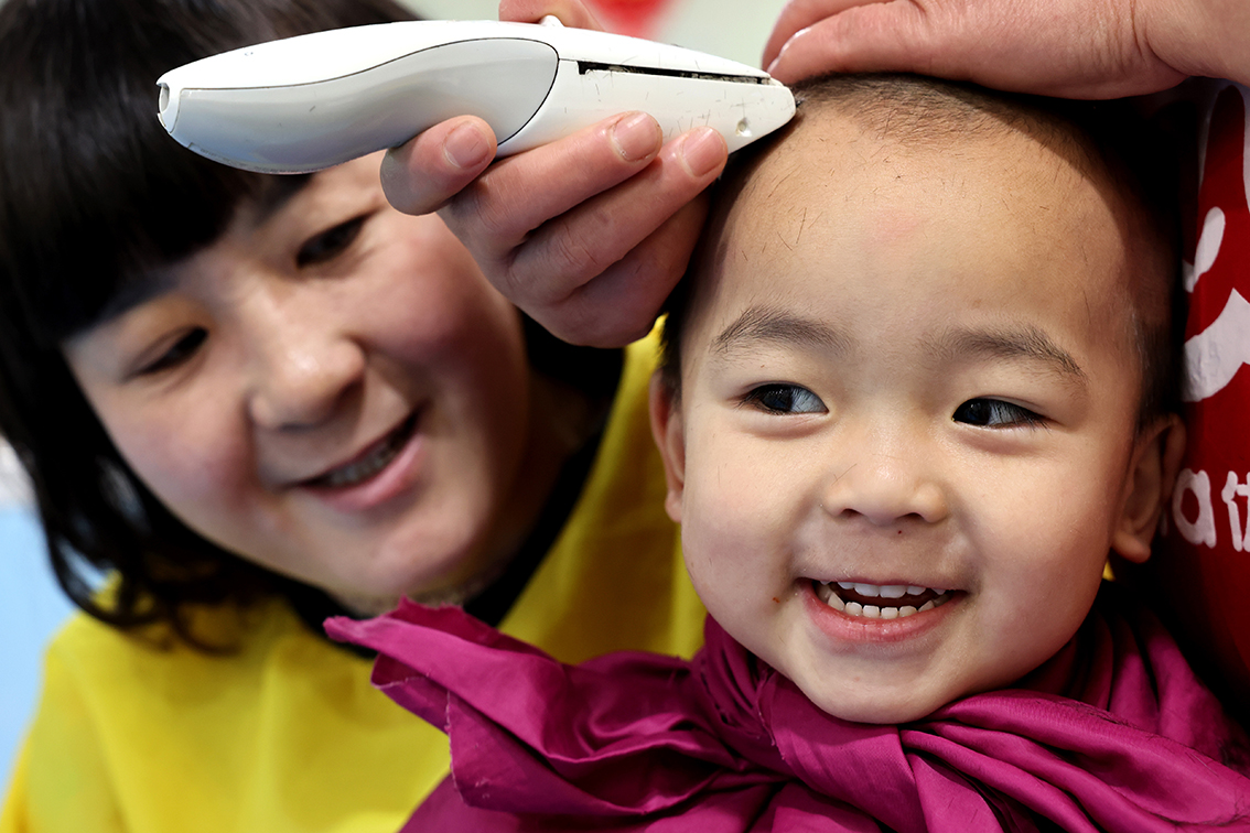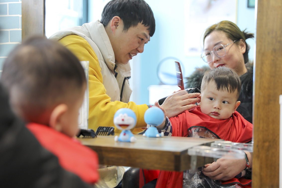 2月21日,在吉林长春一家儿童理发店,理发师为孩子“剃龙头”,寓意辞旧迎新,带来好兆头。(图片来源:中新社)