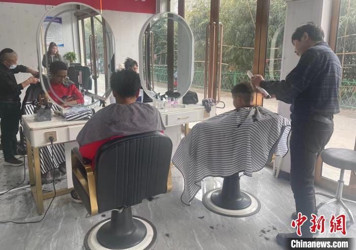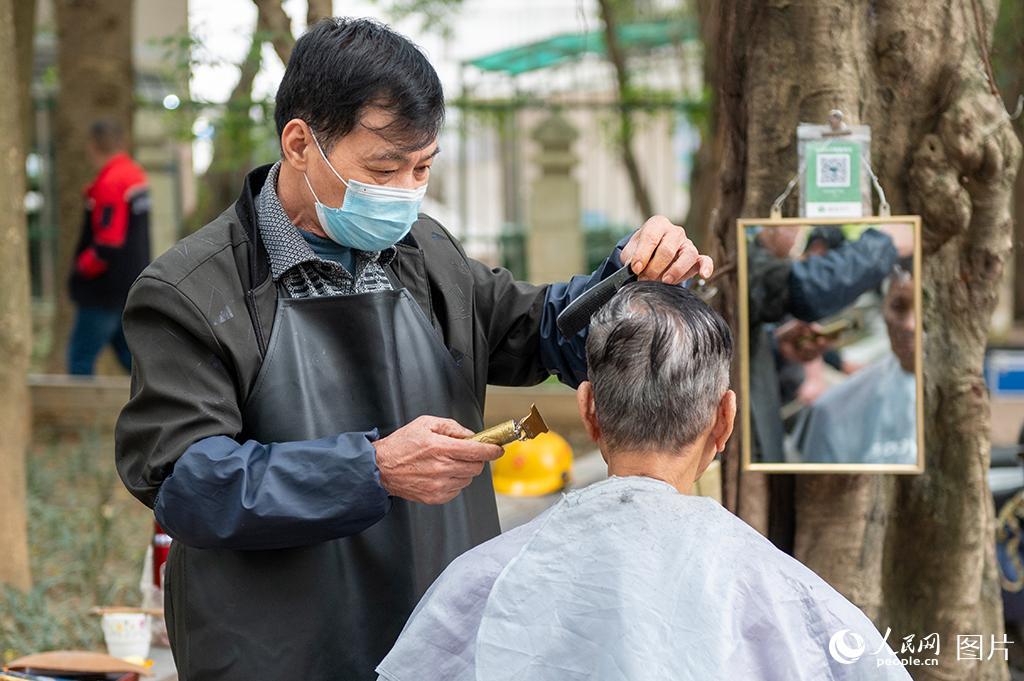 2月21日,在广西南宁市西乡塘区城市广场,剪头发的老师傅说今天来剪头发的市民比往常要多一些。(图片来源:人民网)
