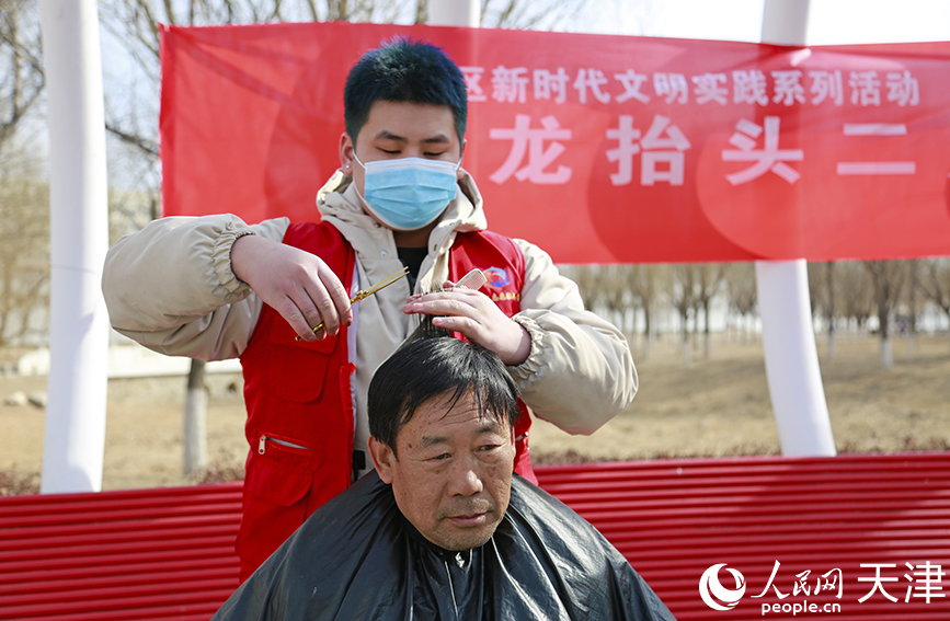 2月21日,天津市西青区张家窝镇家贤里社区举办“春龙抬头二月二民俗文化共传承”活动,社区为居民提供免费理发服务。(图片来源:人民网)