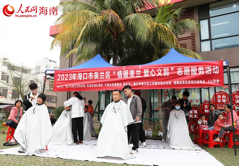 2月21日,海口市美兰区新时代文明实践中心开展了公益理发活动,不少居民前来体验公益服务的暖暖温情。(图片来源:人民网)