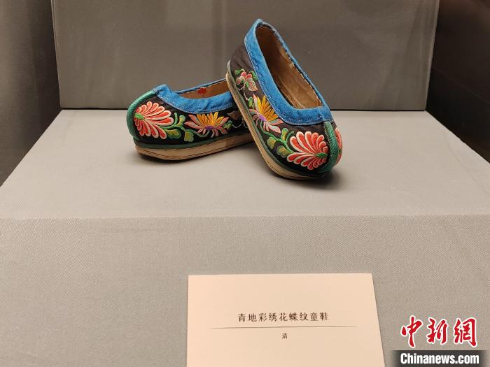 青地彩绣花蝶纹童鞋。(图片来源:中新网)