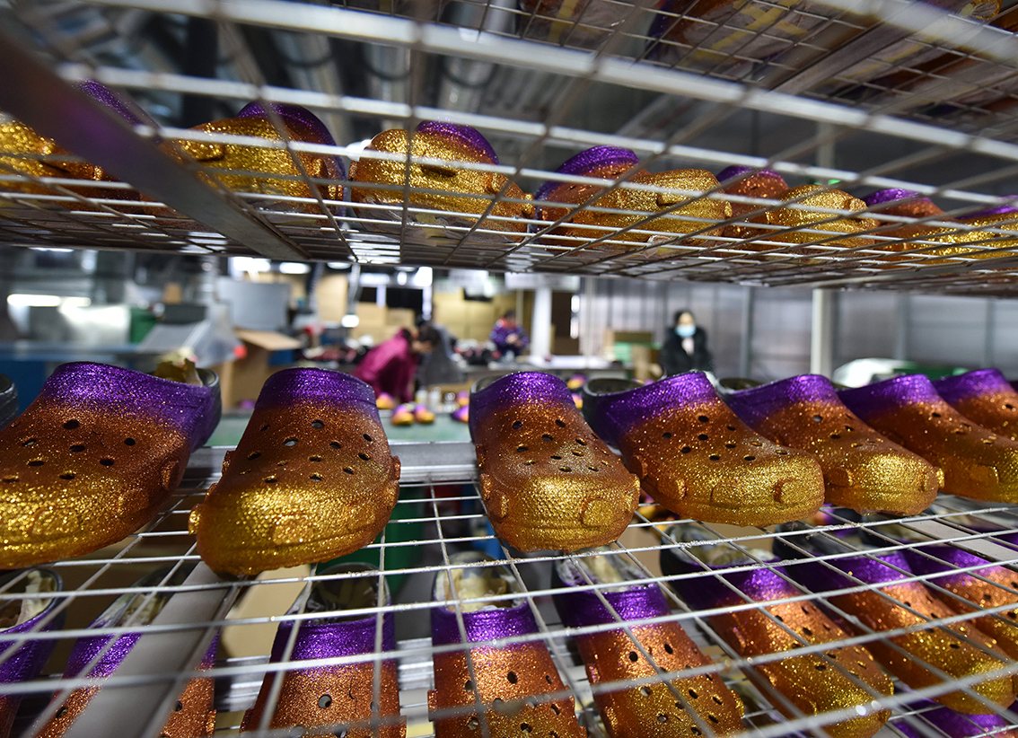 2月25日,工人在湖南省娄底市双峰高新区一外贸制鞋企业成品鞋车间忙碌。