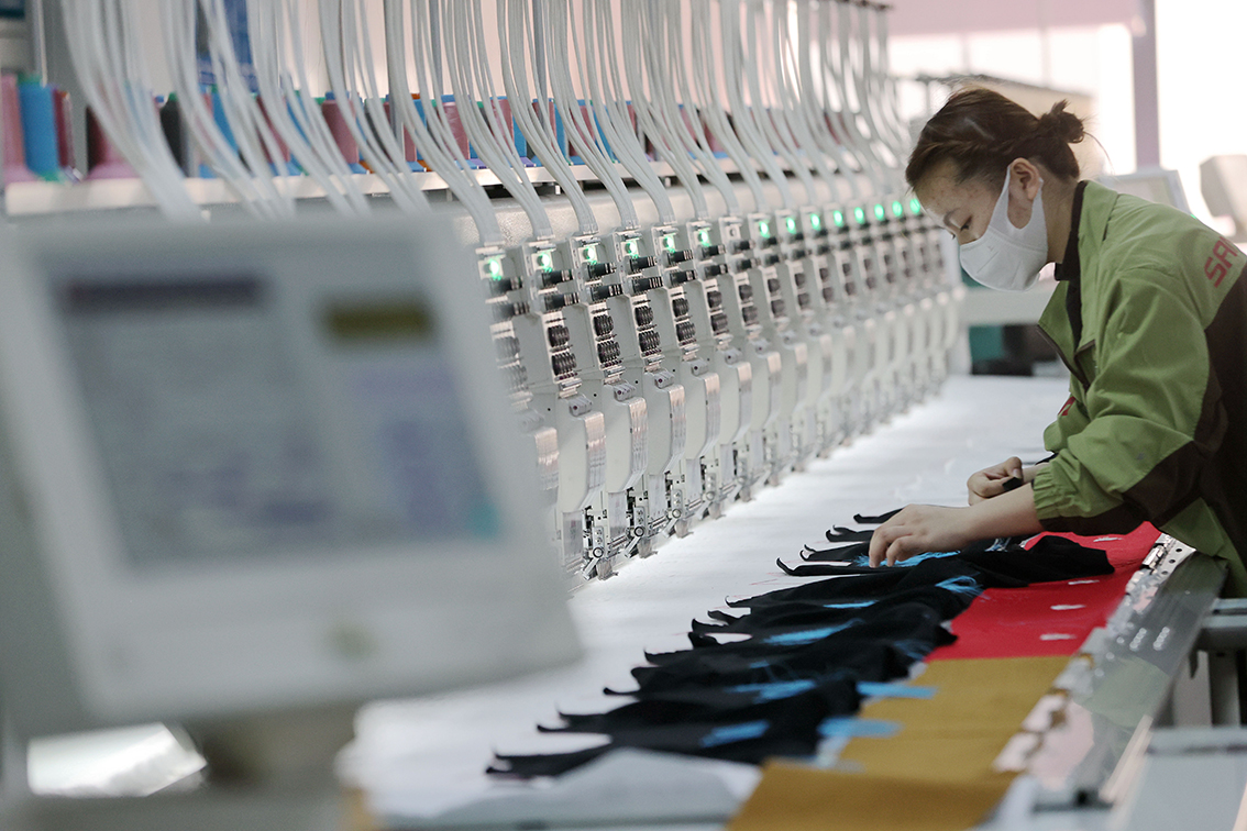 2月25日,工人在浙江省湖州市德清县新安镇一家纺织企业生产车间赶制刺绣订单产品。