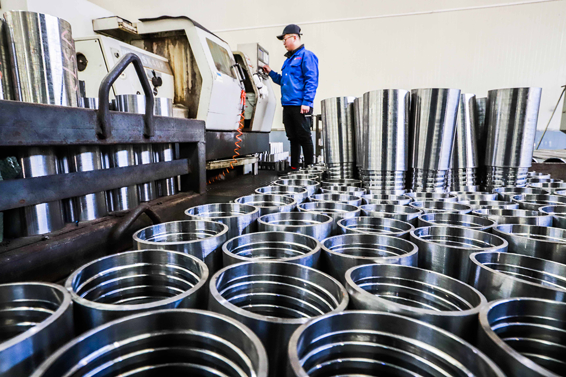 2月25日,工人在位于河北省唐山市路北区的一家金刚石地质岩心钻探设备生产企业车间工作。