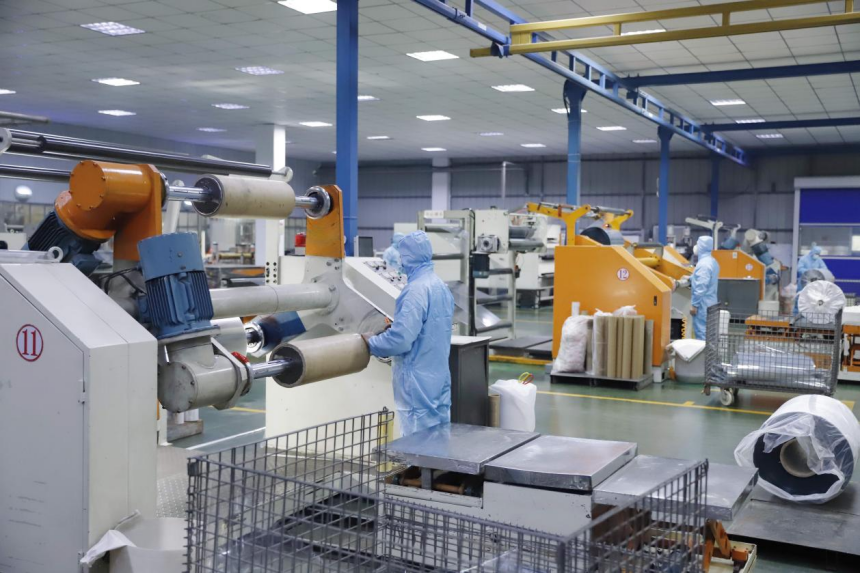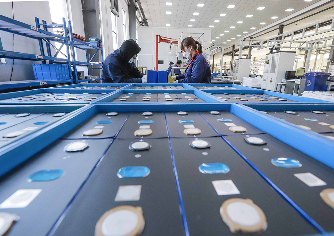 2月25日,工人在位于河北省唐山市路北区的一家新能源电池生产企业车间工作。