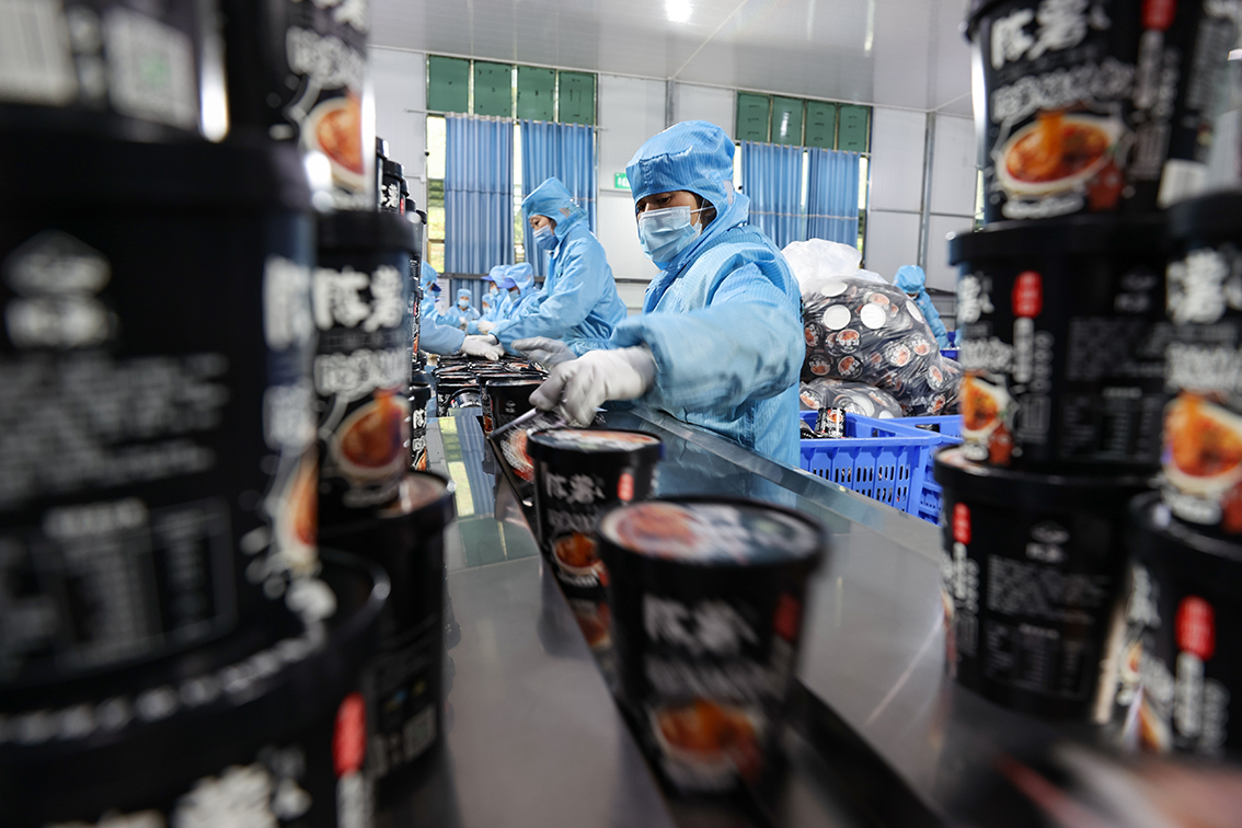 2月14日,在贵州省铜仁市思南县三道水乡的一家红薯全产业链企业车间内,工人正加紧生产、包装一款红薯酸辣粉供应节后市场,一派繁忙景象。(图片来源:中新社)