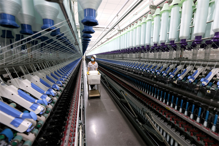 2月24日,在江苏省南通市崇川区江苏大生集团智慧纺纱工厂生产车间,纺织工人在生产车间忙碌。