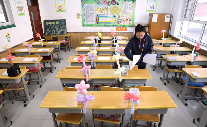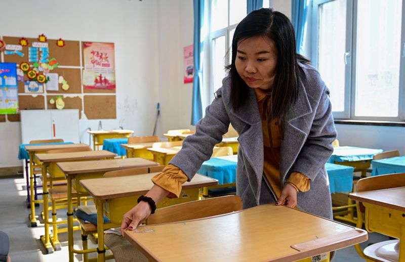 2月27日,辽宁省沈阳市中小学即将迎来新学期,沈阳市浑南区第九小学的老师们为开学做准备工作。图为老师在整理课桌。(图片来源:中新社)