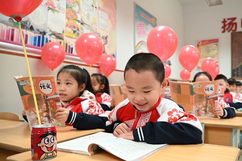2月27日,内蒙古呼和浩特市县府街小学内,学生阅读课文。当日,呼和浩特市各小学迎来春季开学。(图片来源:中新社)