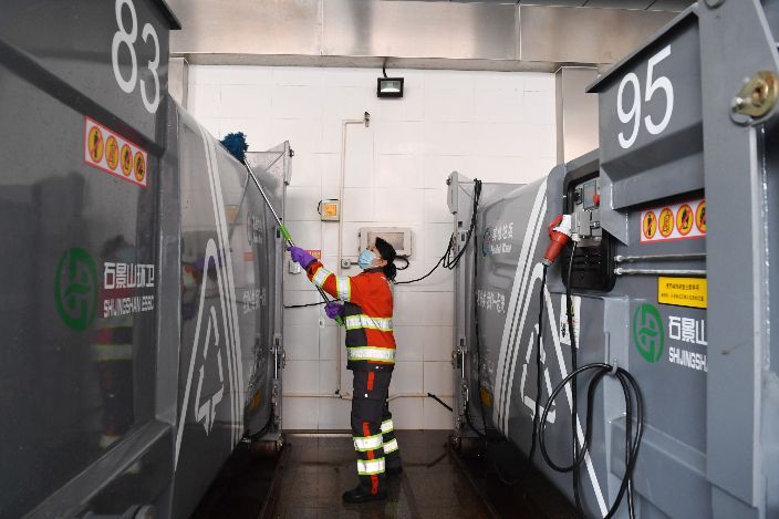 2月17日,刘明群在垃圾清洁站擦洗设备。(图片来源:本文图片均自新华社)