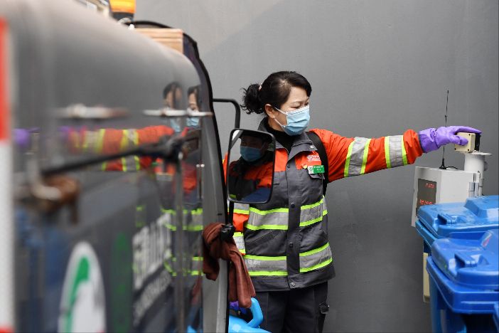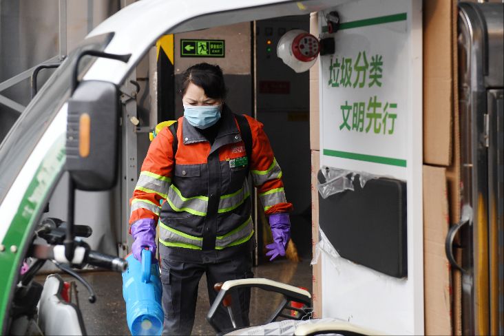 2月17日,刘明群给垃圾清洁站内正在倾倒垃圾的车辆消毒。