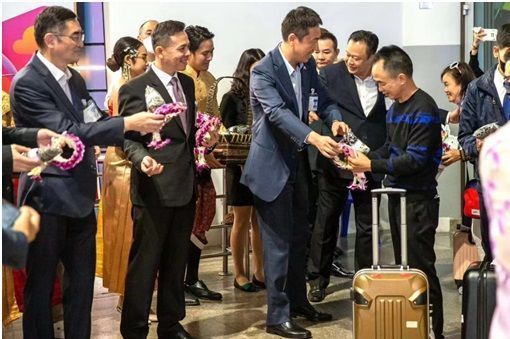 2月6日试点恢复中国公民出境团队游首日,泰国国家旅游局与中国驻泰国大使馆在曼谷廊曼国际机场共同举行隆重、热烈的欢迎仪式,迎接首批来泰中国旅游团。图为中泰双方欢迎人员一同为游客们送上泰式鲜花花环和深受游客喜爱的大象裤。 图片来源:中国驻泰国大使馆