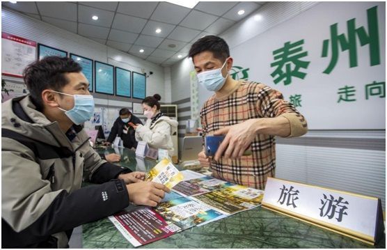 2023年2月9日,市民在江苏泰州市一家旅行社销售网点咨询出境团队游。汤德宏/人民图片