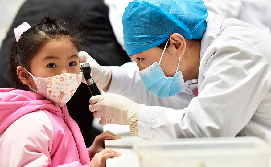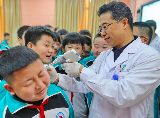 3月2日,河北省秦皇岛市第七中学玉龙湾校区联合秦皇岛市第一医院开展“爱耳知识进校园”活动。图为医生给学生检查耳朵。(图片来源:央广网)