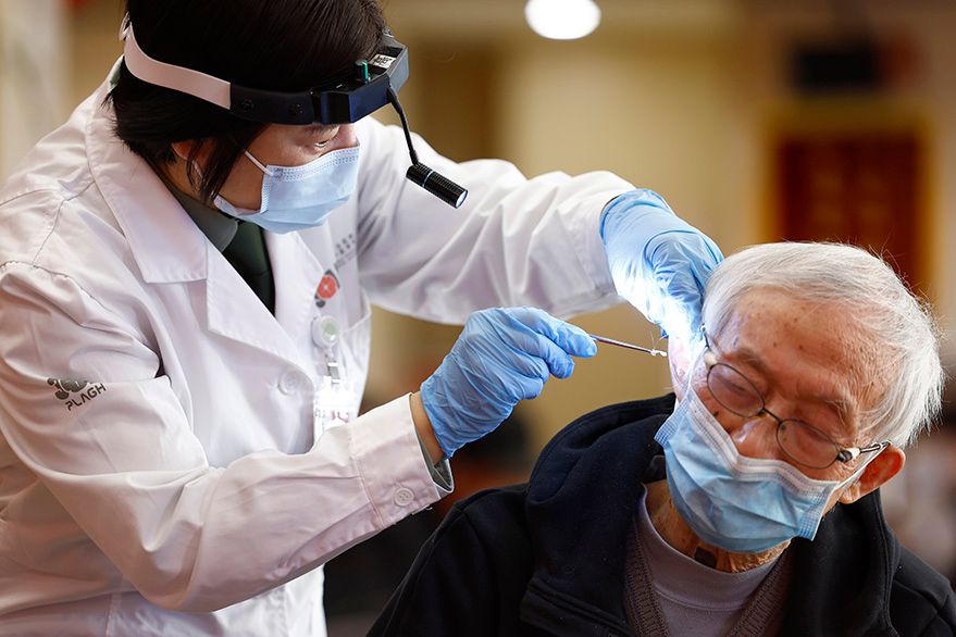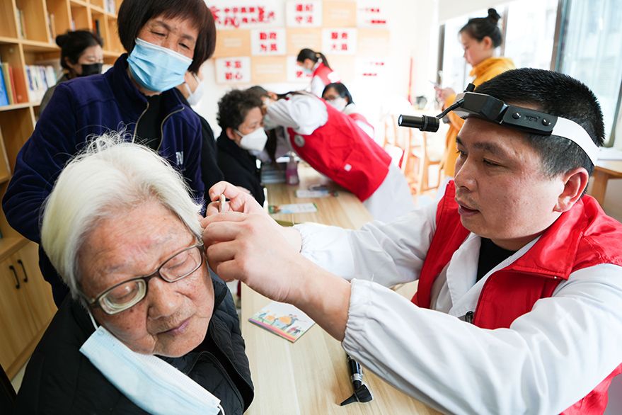 3月2日,在浙江省瑞安市玉海街道东镇社区,耳鼻喉科专家、助听器专业技术人员正在为群众检查耳朵听力和宣传用耳健康知识。