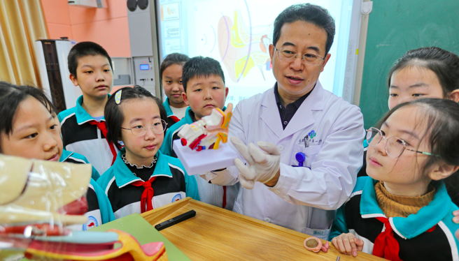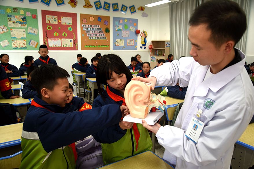 3月2日,河北省秦皇岛市第七中学玉龙湾校区联合秦皇岛市第一医院开展“爱耳知识进校园”活动。图为医生给学生讲解爱耳护耳知识。(图片来源:央广网)