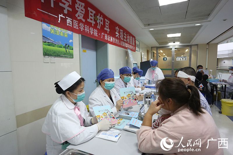 3月1日上午,“爱耳日”大型公益义诊活动在广西医学科学院·广西壮族自治区人民医院桃源院区门诊楼5楼耳鼻喉头颈科门诊举行。(图片来源:人民网)