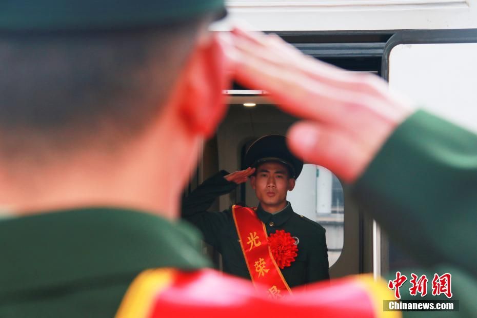 3月1日上午,武警重庆总队执勤第三支队,50余名退伍老兵戴上红花、披上绶带,告别军旗与战友,踏上返乡归途。图为站台上退伍老兵相互敬礼话别。(图片来源:本文图片除标注外均自中新网)