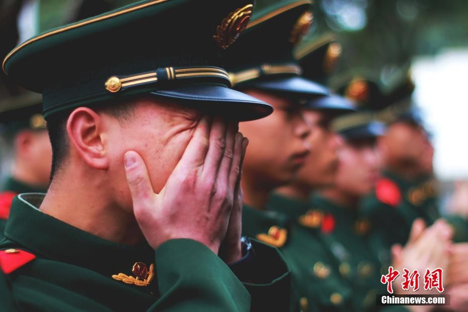 3月1日,武警天津总队执勤四支队首批春季退役老兵佩戴红花,挥手泪别战友和军营,踏上了返乡的列车。2月28日上午,支队举行退役士兵向军旗告别仪式和枪支交接仪式。(图片来源:人民网)