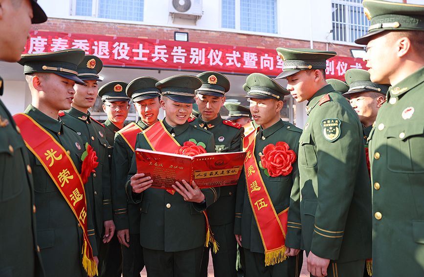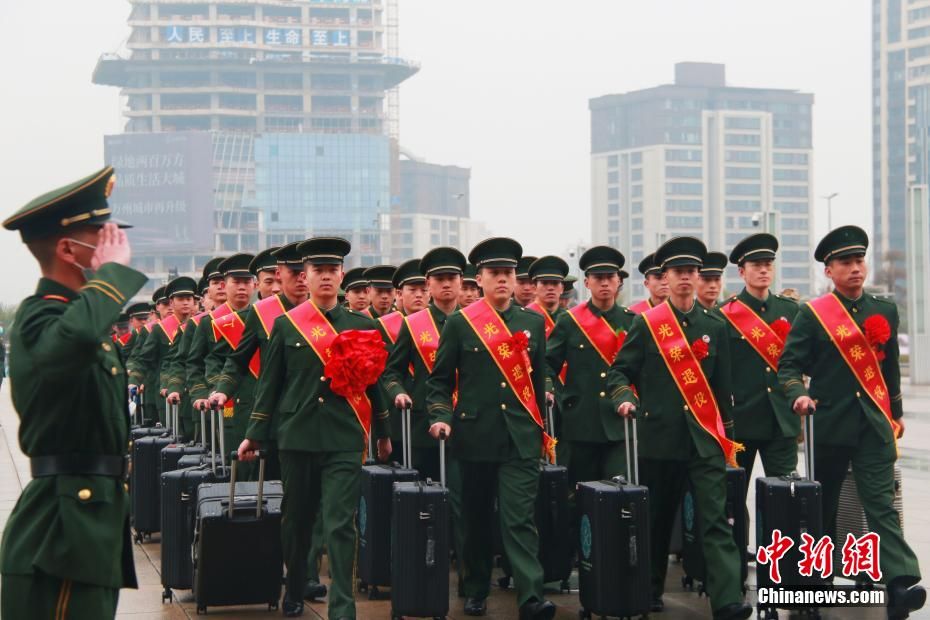 3月1日上午,武警重庆总队执勤第三支队,50余名退伍老兵戴上红花、披上绶带,告别军营,踏上返乡归途。