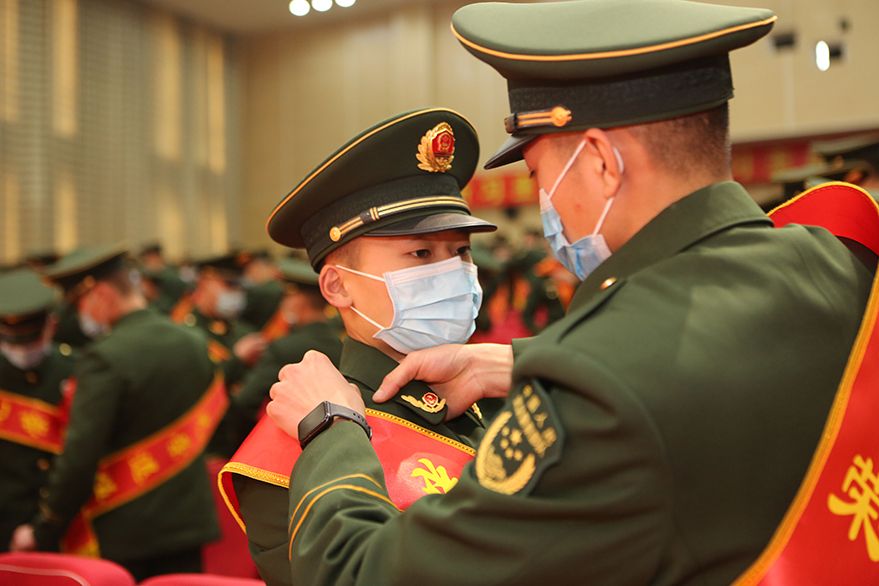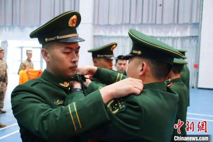 2月28日上午,武警第一机动总队机动某支队举行2023年首批春季士兵退役仪式,图为退役士兵卸下肩章。(图片来源:人民网)