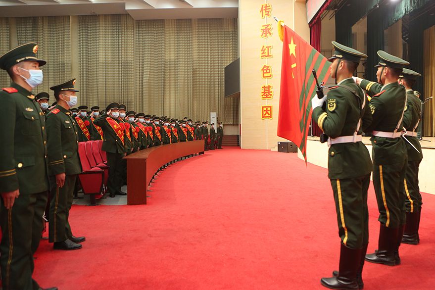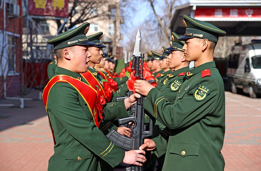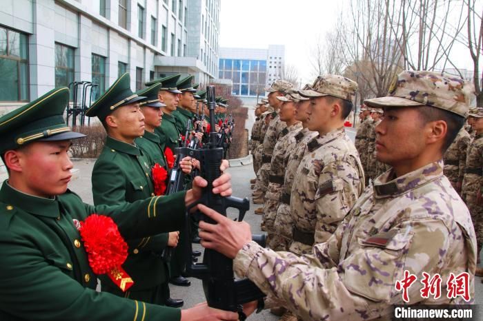 武警青海总队700余名老兵迎来了他们军旅生涯的“毕业季”,图为退役士兵与新兵进行装备交接仪式。