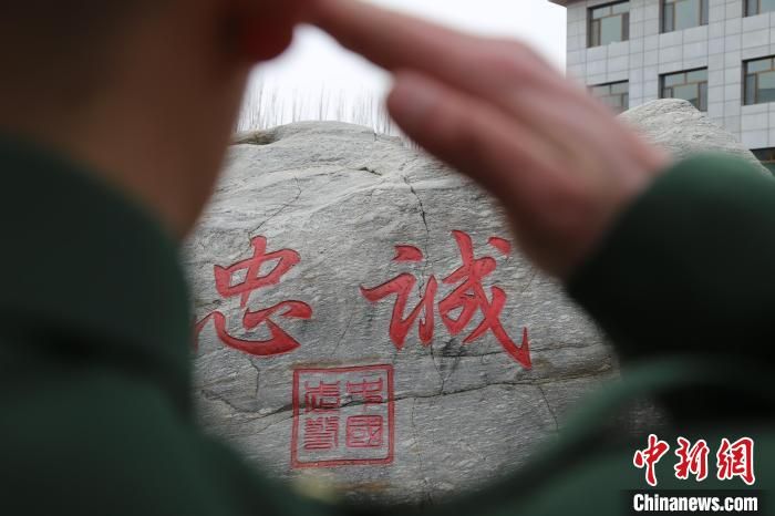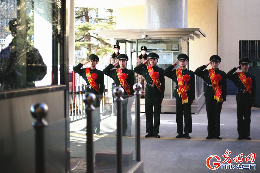 2月28日,武警北京总队执勤第六支队隆重举行退役老兵欢送仪式暨向武警部队旗告别仪式,图为告别坚守两年的哨位。(图片来源:光明网)