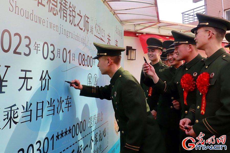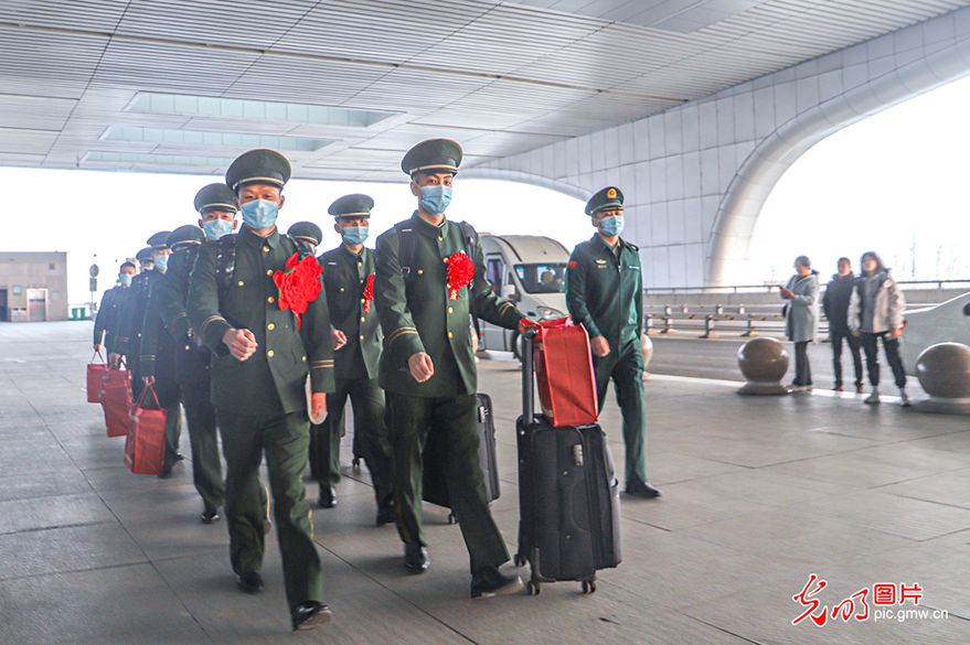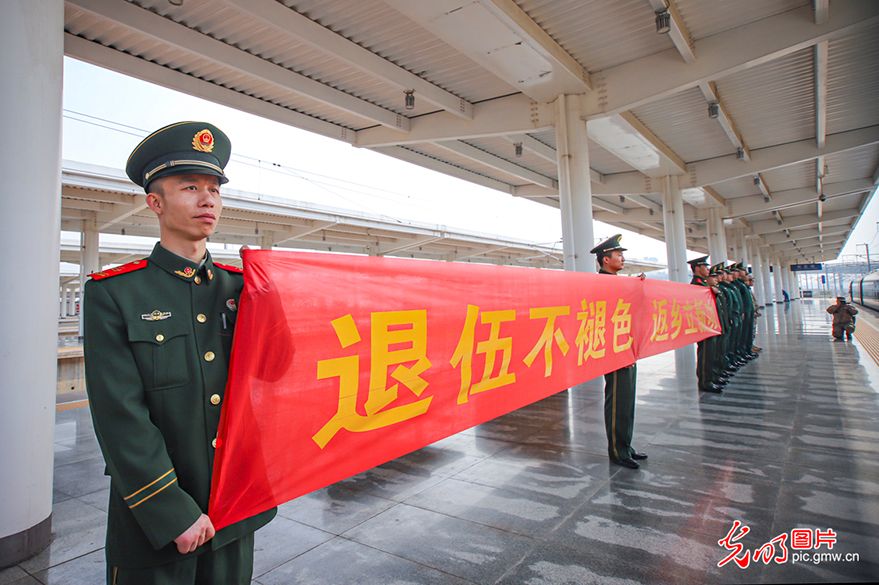 2023年3月1日,武警河南总队多种形式欢送老兵,祝老兵退伍不褪色,返乡立新功。图为当日,退伍老兵有序进站。(图片来源:光明网)