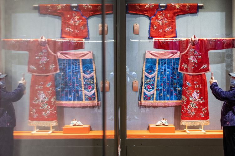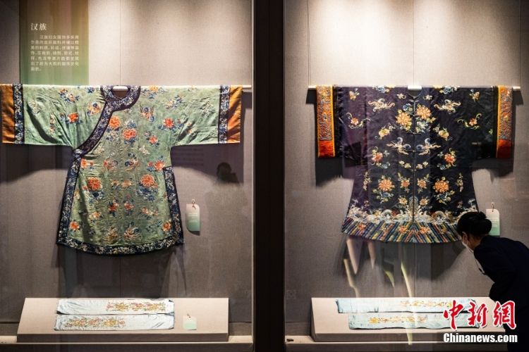 汉族婚庆用的绚丽服饰展品吸引观众参观。(图片来源:中新社)