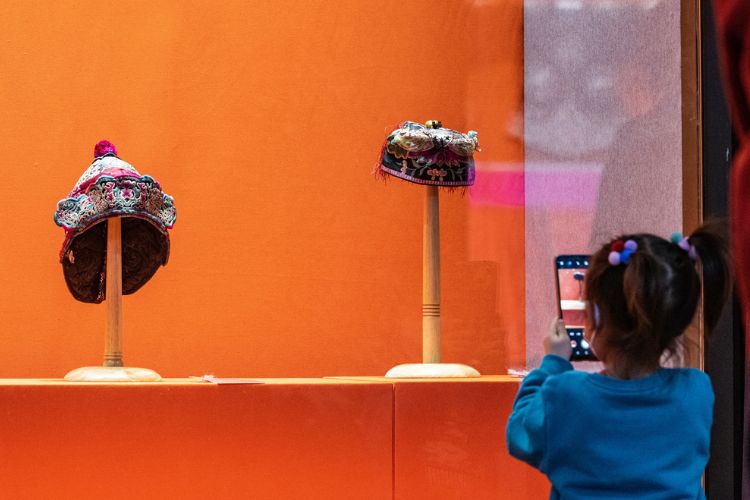 一名小朋友用手机拍摄绣花孩帽展品。(图片来源:中新社)