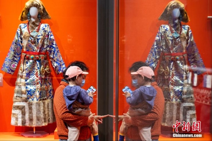 老人带着孩子参观康巴藏族服饰。(图片来源:中新网)