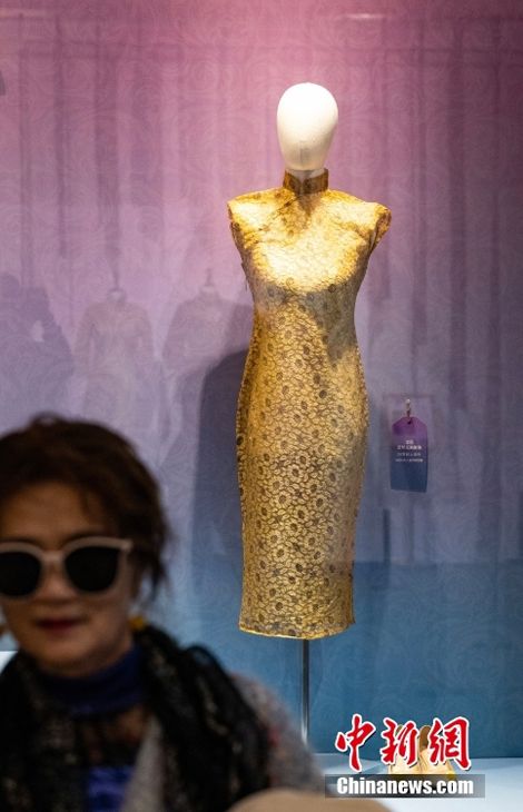 一套20世纪上半叶的金色蕾丝无袖旗袍展品。(图片来源:中新网)