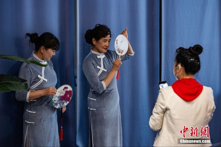 两位身着旗袍的中年女士与同伴拍照留念。(图片来源:中新网)
