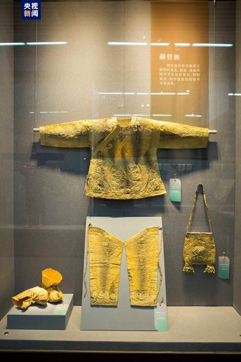 展览展出20世纪下半叶赫哲族鱼皮衣、裤、鞋、包。(图片来源:央视新闻客户端)