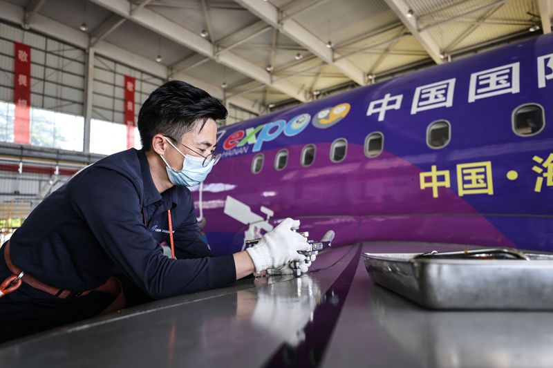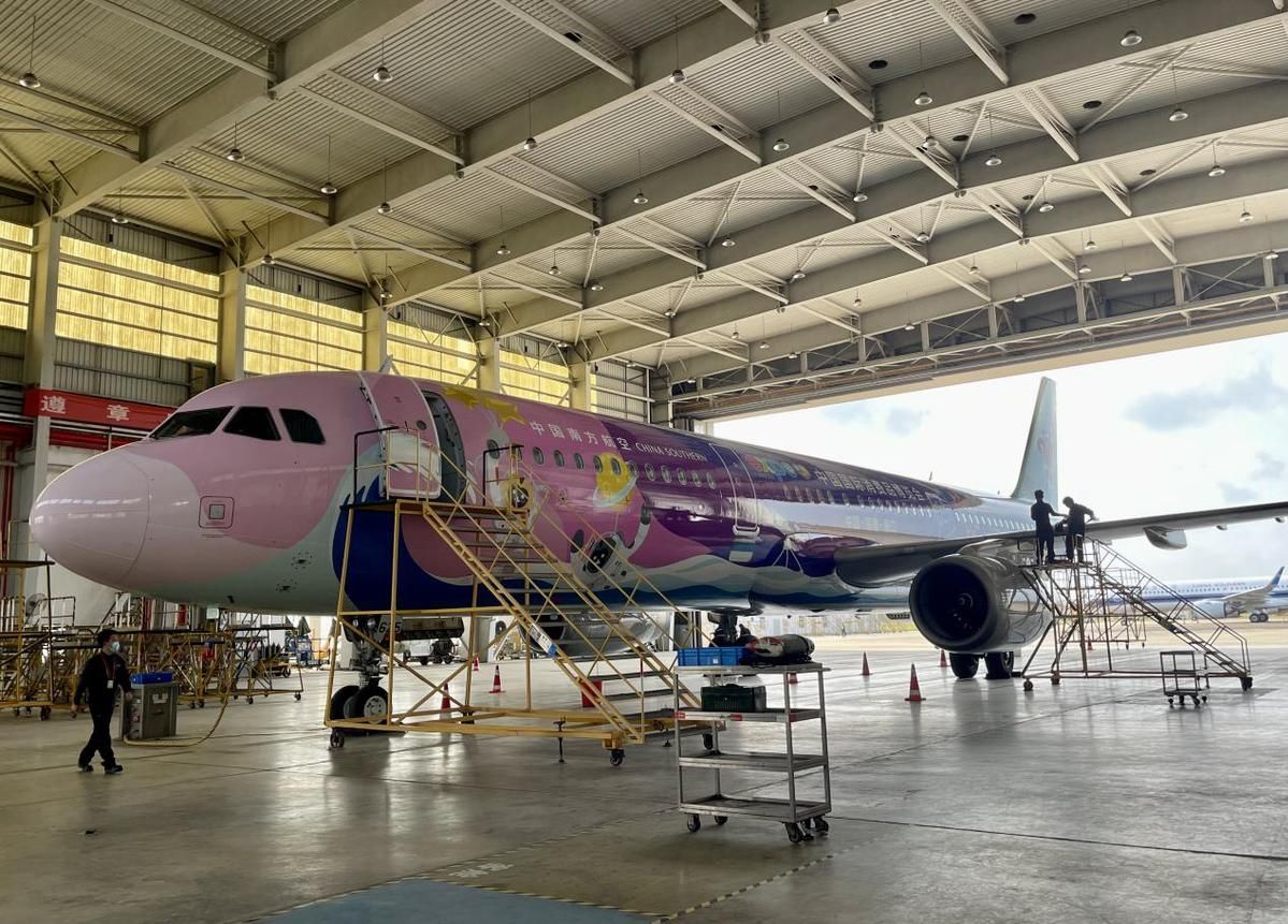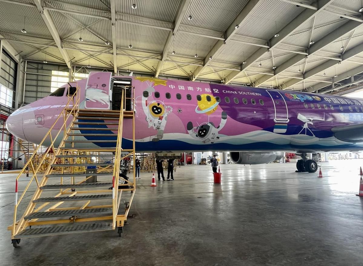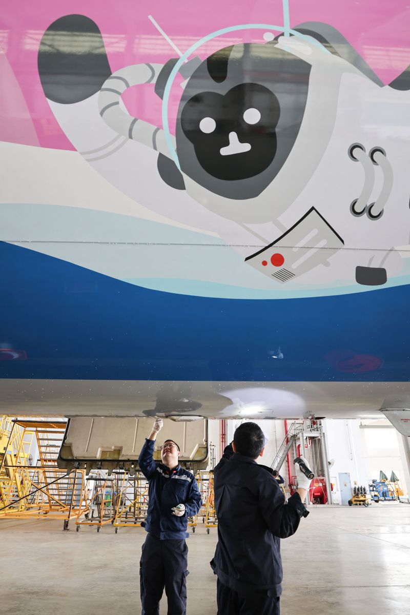 南航机务人员对“消博号”彩绘飞机进行深度检查。(图片来源:中国日报网)