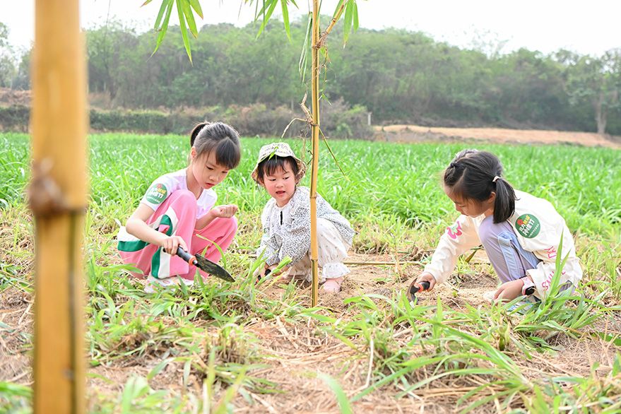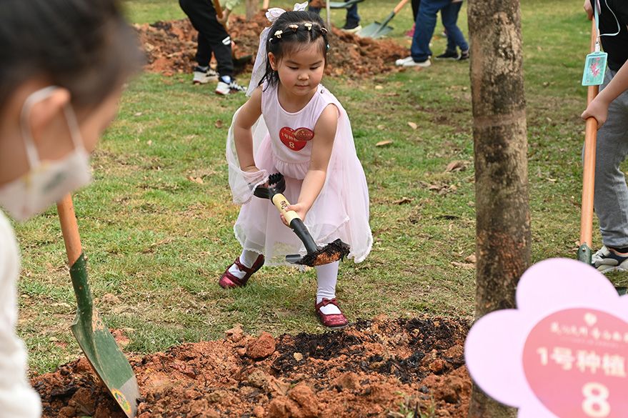 3月12日,广东省广州市,小朋友栽种竹苗。当日,一场植树节公益活动在长隆野生动物世界举行。活动中,55组亲子家庭在工作人员指导下种下竹苗。(图片来源:中新社)