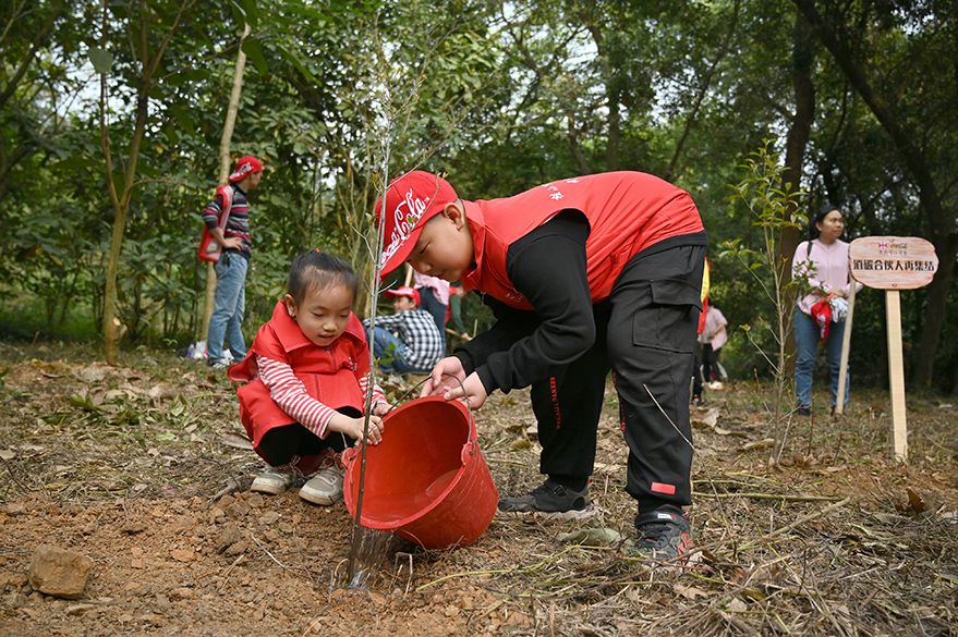 3月12日,广西南宁市良凤江国家森林公园内,小志愿者植树为城市添绿色。当天正值植树节,不少民众来到该景区开展植树相关活动。(图片来源:中新社)