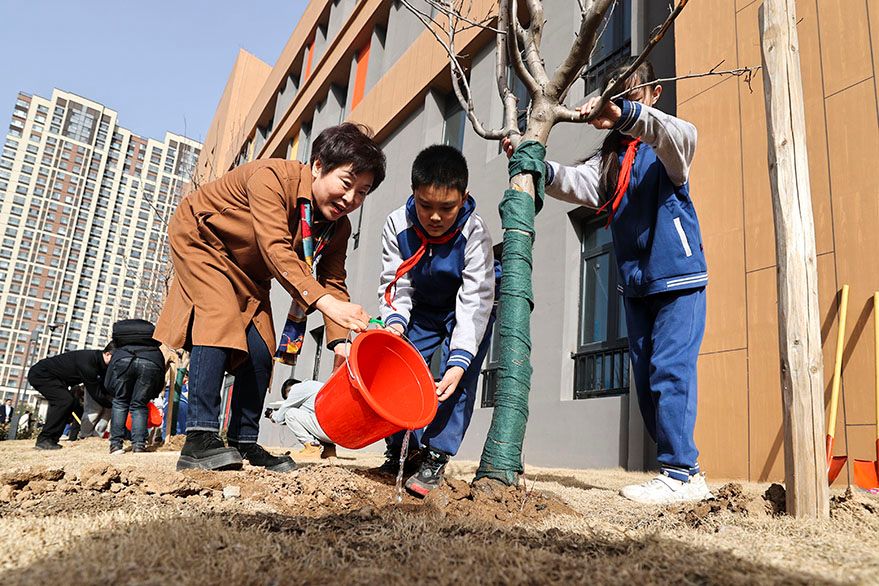 3月10日,第45个植树节前夕,太原新建路小学开展植树育人活动,师生在校园内植树。活动在绿化校园的同时,也教导学生爱护环境保护树木。(图片来源:中新社)