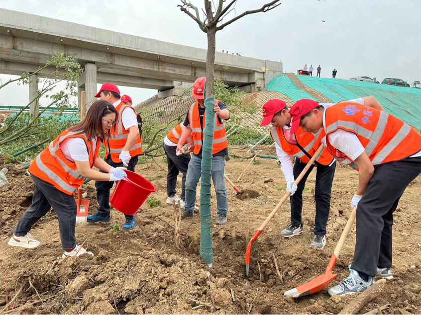 3月10日,在武汉至大悟高速公路青峰互通收费站附近,在汉央企中国一冶交通公司组织武汉片区90余名职工开展了“还绿生态林,共创护平安”主题植树活动,为武大高速再添新绿。(图片来源:中国日报网)