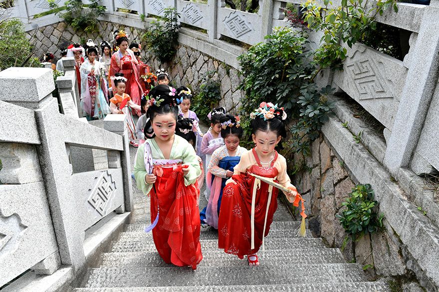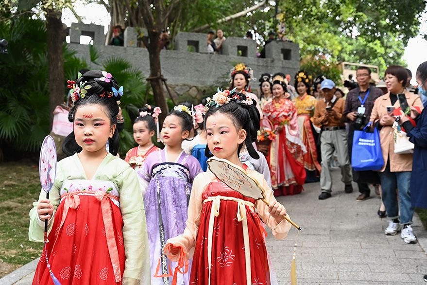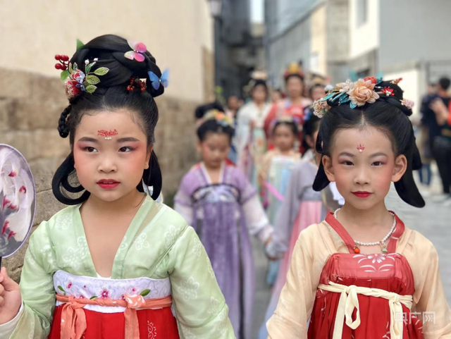 3月11日,福建福州,身穿汉服的小演员和汉服爱好者在烟台山巡游。(图片来源:中新社)