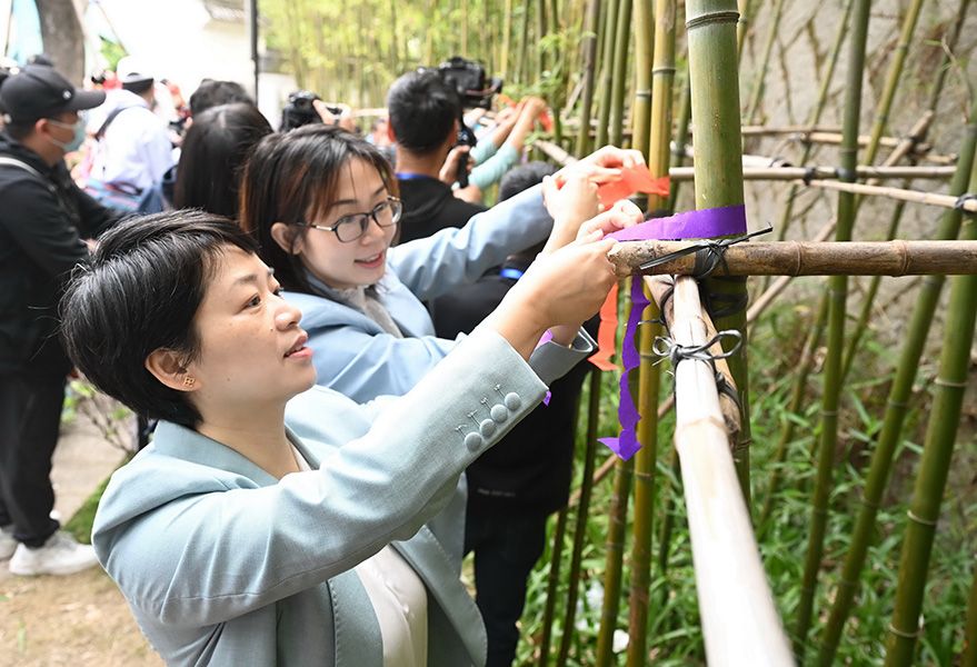 3月11日,在福州烟台山公园,市民系扎彩带,传递对春天和未来的美好祈愿与祝福,体验“赏红”习俗。