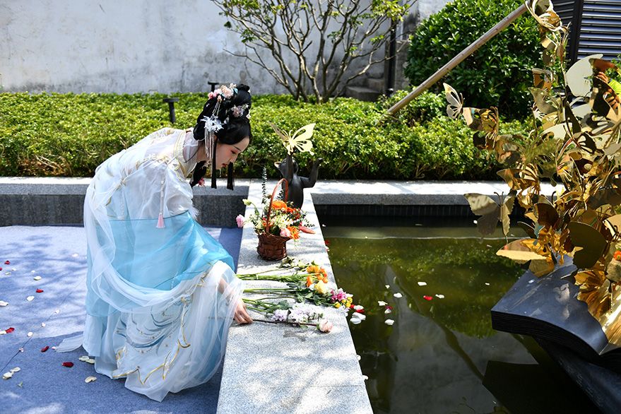 3月11日,福建福州,身着汉服的演员依据花朝节传统习俗举行“花神祭”。(图片来源:中新社)