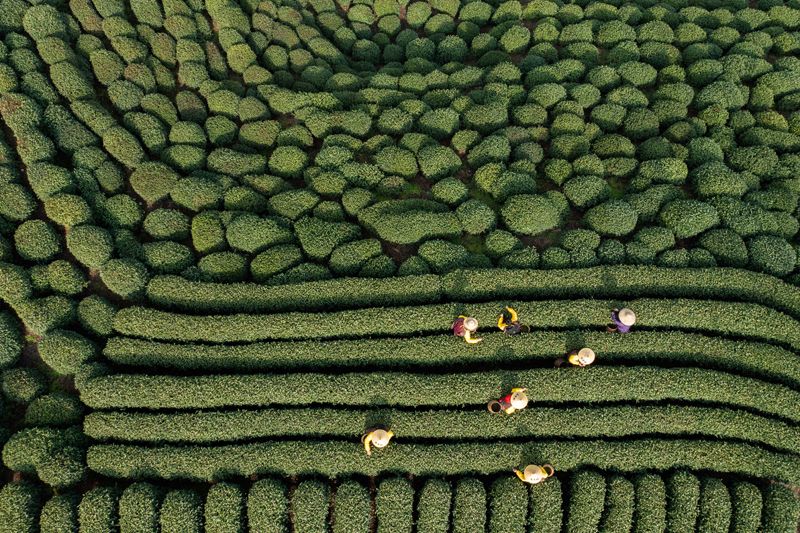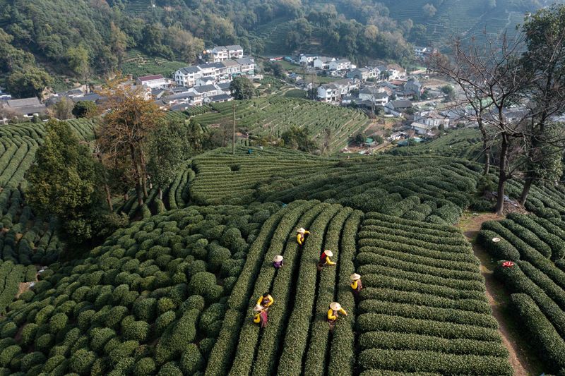 3月13日,龙井村的茶农在采摘西湖龙井“明前茶”(无人机照片)。(图片来源:新华社)