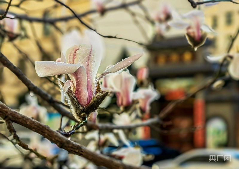 近日,在甘肃省庆阳市西峰区北地东路,花朵硕大的玉兰花悄然绽放。(图片来源:央广网)
