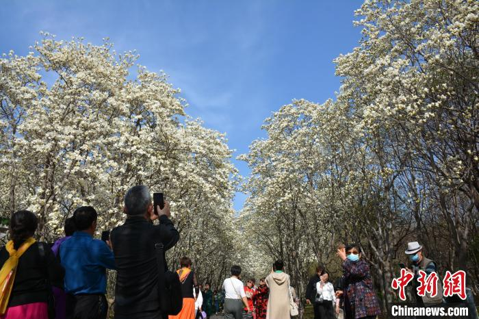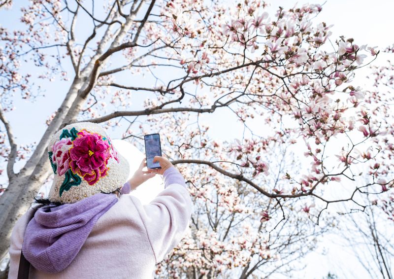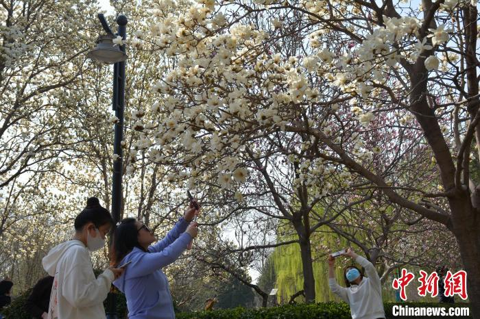 3月9日,山东济南,百花公园玉兰大道两侧玉兰花争相绽放,众多游人和摄影爱好者前来观赏拍摄盛开的玉兰花。(图片来源:中新网)