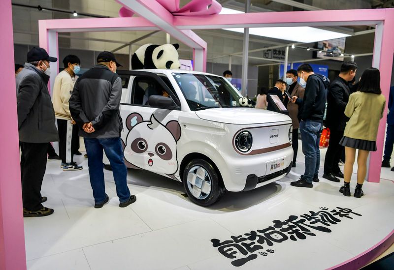 3月15日,2023第十三届新疆3·15国际车展在乌鲁木齐开幕,前来参观的市民被一款新能源纯电迷你车型所吸引。(图片来源:中新社)