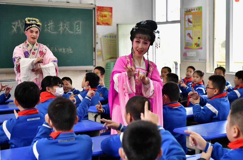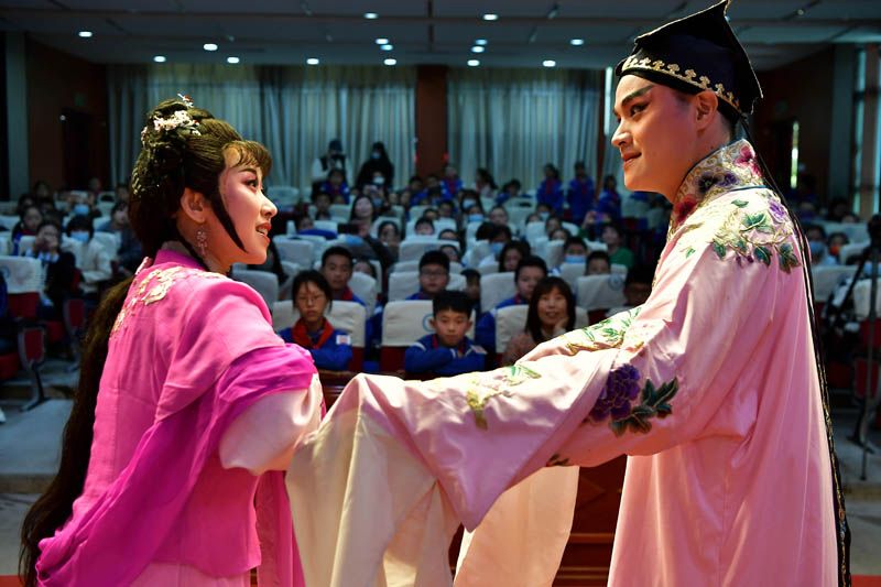 3月15日,闽剧演员为学生们表演闽剧。当日,“以独具匠心多彩‘遗’迹”为主题的非遗文化进校园活动在福建省福州市仓山区第六中心小学举行。闽剧又称福州戏,2006年被列为第一批国家级非物质文化遗产。(图片来源:中新社)